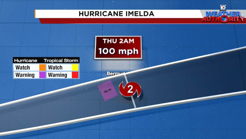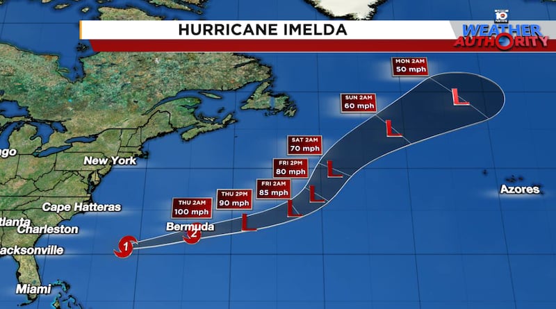 Hurricane Imelda is accelerating away from the U.S., but strengthening on a beeline to Bermuda for later today, where it’s forecast to bring strong winds to 100-plus mph, flooding rains, and powerful and destructive waves.