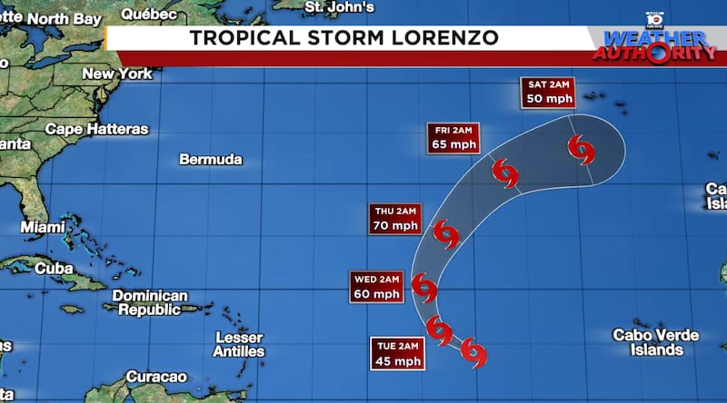 Tropical Storm Lorenzo, the 12th named storm of the hurricane season, formed early Monday over the central tropical Atlantic from a tropical disturbance that rolled off Africa late last week.