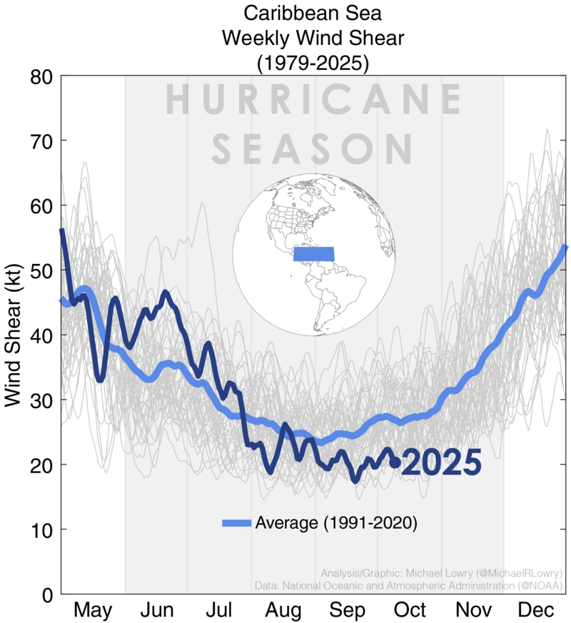 Interestingly, wind shear in the Caribbean has been running historically low through the heart of the season – consistent with a budding La Niña in the eastern equatorial Pacific. Since September, wind shear across the Caribbean has been the third lowest since 1979.