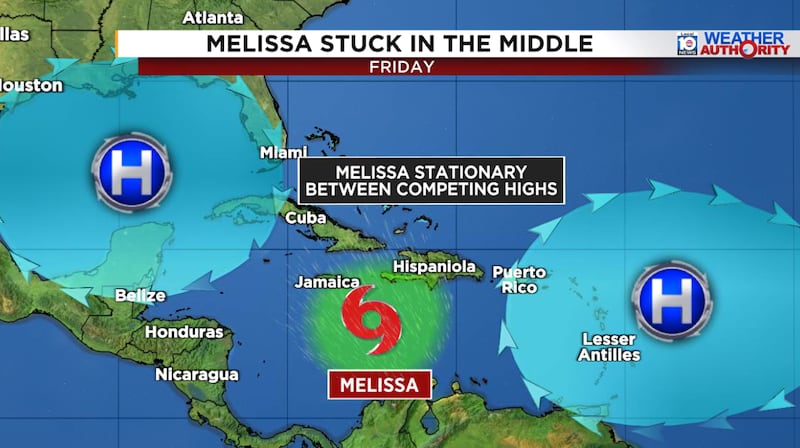 Melissa’s caught between two weak but competing high pressure steering zones, leading to an agonizing drift that will plague the north-central Caribbean with torrential tropical rains into early next week.