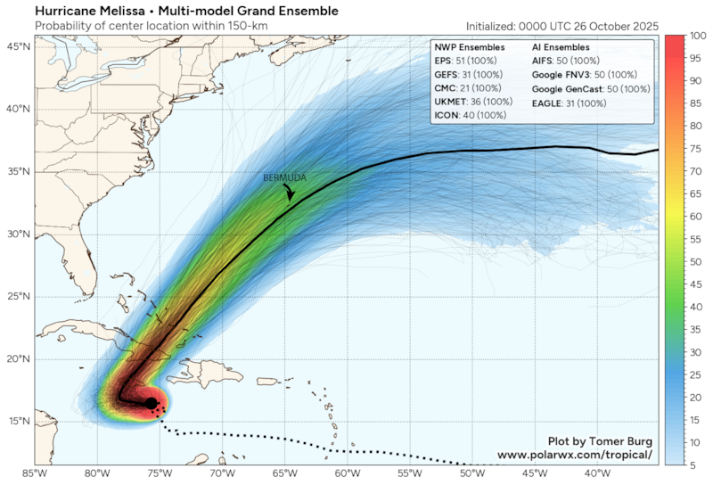 Once Melissa passes across Jamaica, it will accelerate through eastern Cuba, the southeastern Bahamas, and Turks and Caicos late Tuesday and Wednesday, perhaps as a still-major (Category 3 or stronger) hurricane.