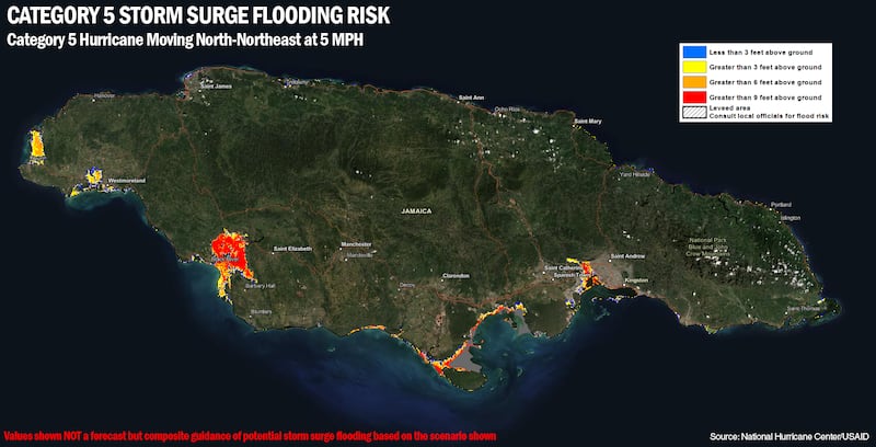 The National Hurricane Center is forecasting a life-threatening storm surge reaching 9 to 13 feet along Jamaica’s south shore, which will almost certainly be worsened along the exposed coast by powerful large and battering waves.