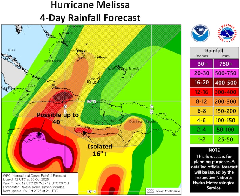 Widespread totals of 15 to 30 inches (380 to 760 mm) are forecast for not only Jamaica but across parts of southern Haiti in the coming days, with rainfall topping 40 inches (1000 mm) in some spots. These extreme rainfall totals will lead to catastrophic flooding and numerous landslides through early next week.