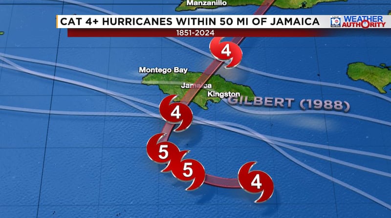 Every Category 4 or stronger hurricane to pass within 50 miles of Jamaica came from the east – including Gilbert in 1988 – and no Category 5 hurricane has ever struck Jamaica in the known records.