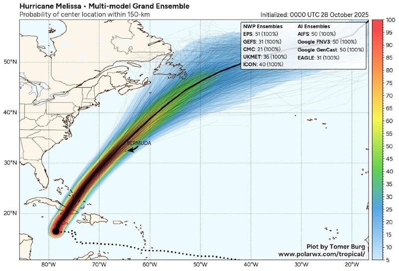Melissa will be moving very quickly as it passes near or west of Bermuda as a Category 1 or 2 hurricane late Thursday into early Friday.