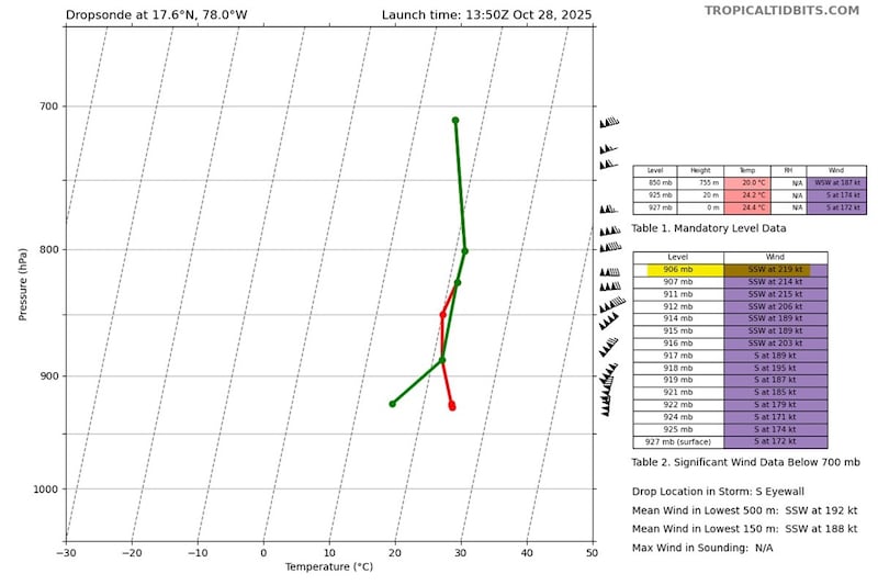 Shortly before 10 a.m. ET Tuesday, NOAA Hurricane Hunters flying Melissa dropped an instrument into its powerful southern eyewall that measured an instantaneous wind – an extreme gust – of 252 mph just above the ocean surface.
