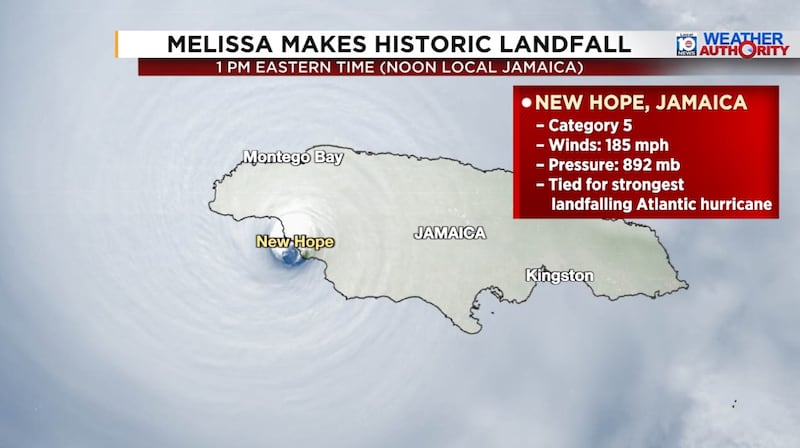 MONTEGO BAY, Jamaica — Category 5 Hurricane Melissa set a collision course early Tuesday with Jamaica and made landfall at New Hope, Jamaica, on the island country’s southwest coast at peak strength around noontime local on Tuesday.