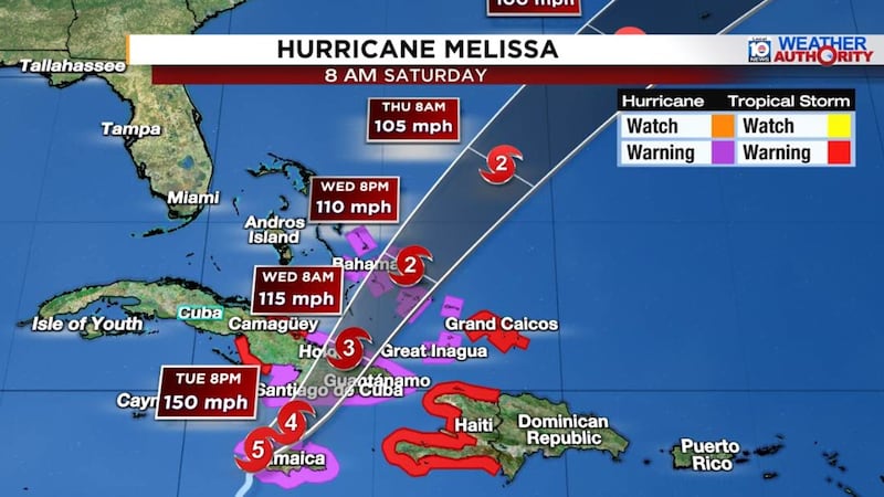 Tropical Storm winds will likely impact the Turks and Caicos, but winds should stay below hurricane strength as Melissa makes its closest pass Wednesday afternoon and evening.