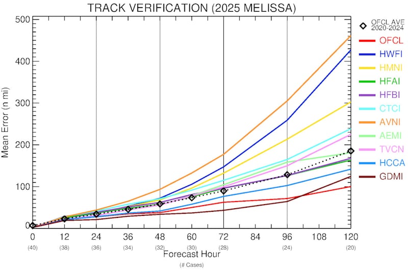 The GFS was especially awful in its forecast for Melissa, with an average 5-day track error ballooning to 500 miles, insisting on a turn out to sea that never transpired.