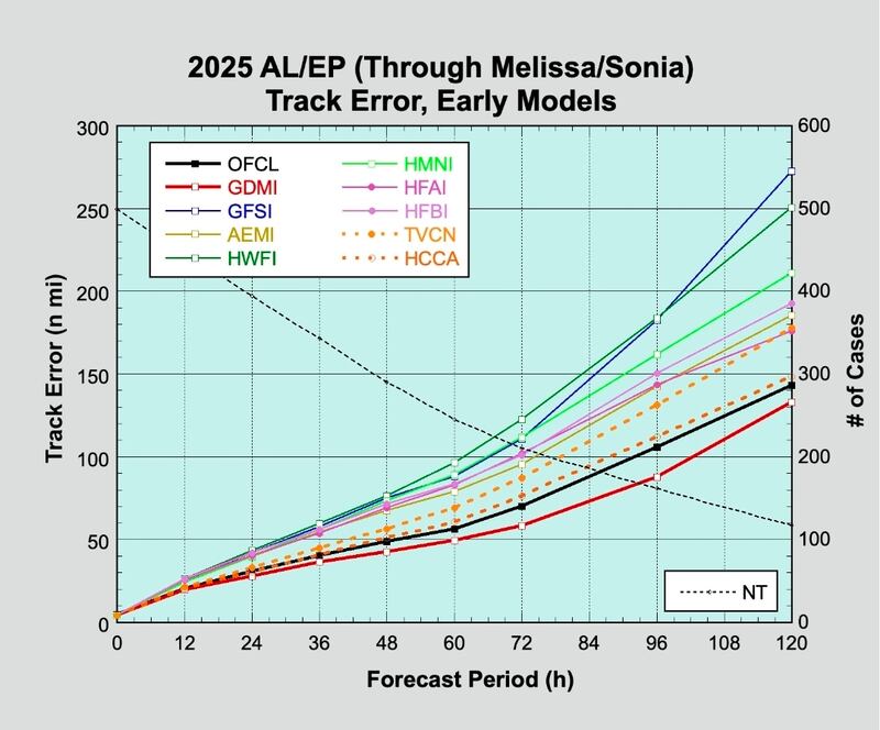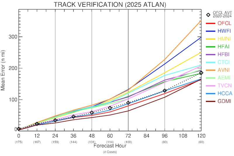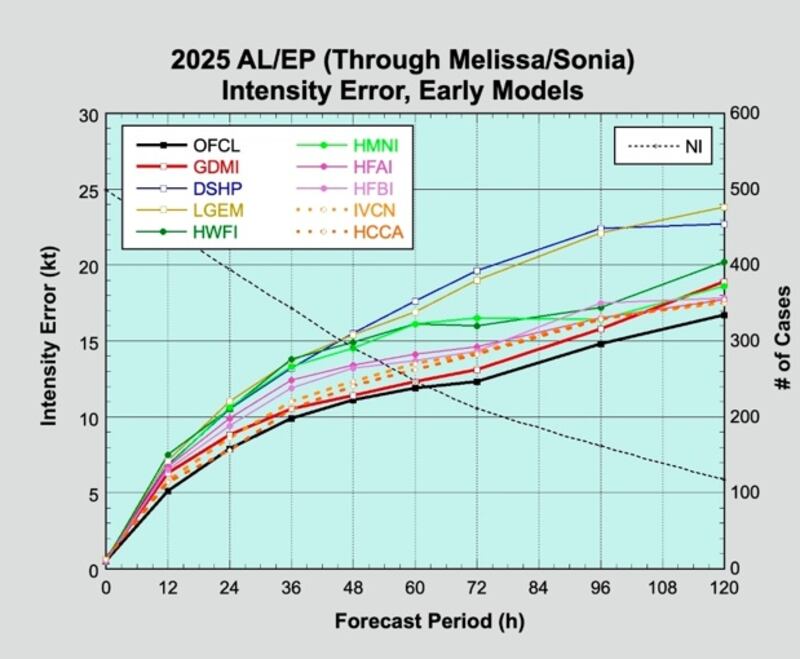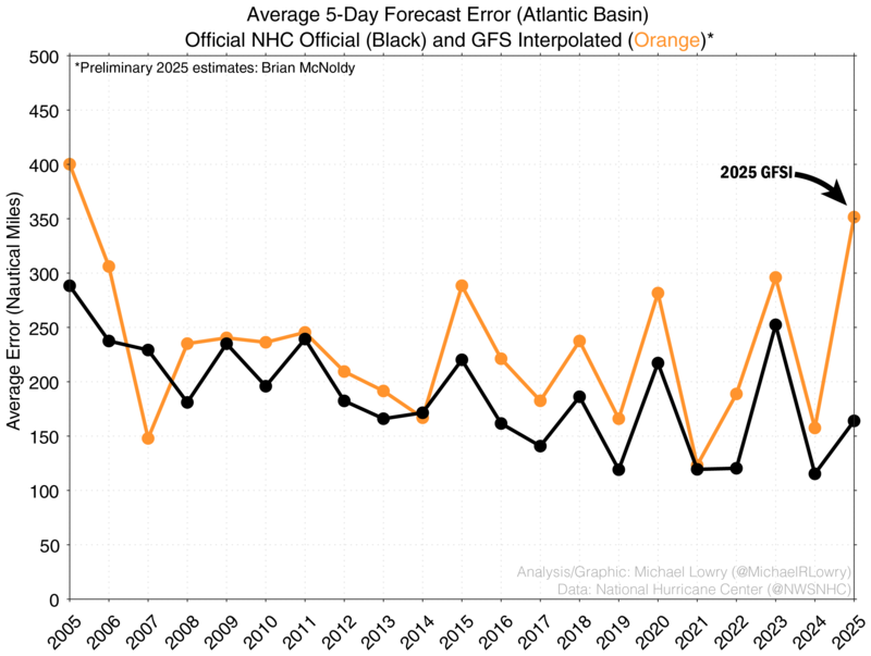 According to preliminary verification compiled by University of Miami hurricane expert and researcher Brian McNoldy, the GFS was head-and-shoulders the worst-performing public forecast model of the 2025 Atlantic hurricane season (note: he did not evaluate the European model and its offshoots since they are not yet publicly available, but the Euro assuredly outperformed the GFS this season).